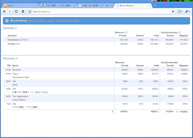 Firefoxの方がメモリーの使用量は少ないですね。