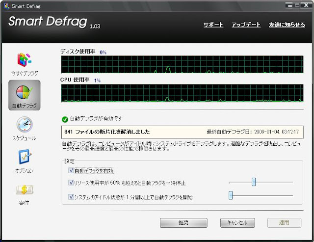 このソフトは常駐ソフトで自動的にデフラグをしくれるのです。デフォルトのままだと、アイドル時間が1分になるとデフラグを開始し、CPUの使用率が20%以上になるとデフラグを中止します。つまり、空いてる時間にちょこちょこと最適化してくれるんのです。知らぬ間に断片化されているファイルがなくなっているという優れものです。